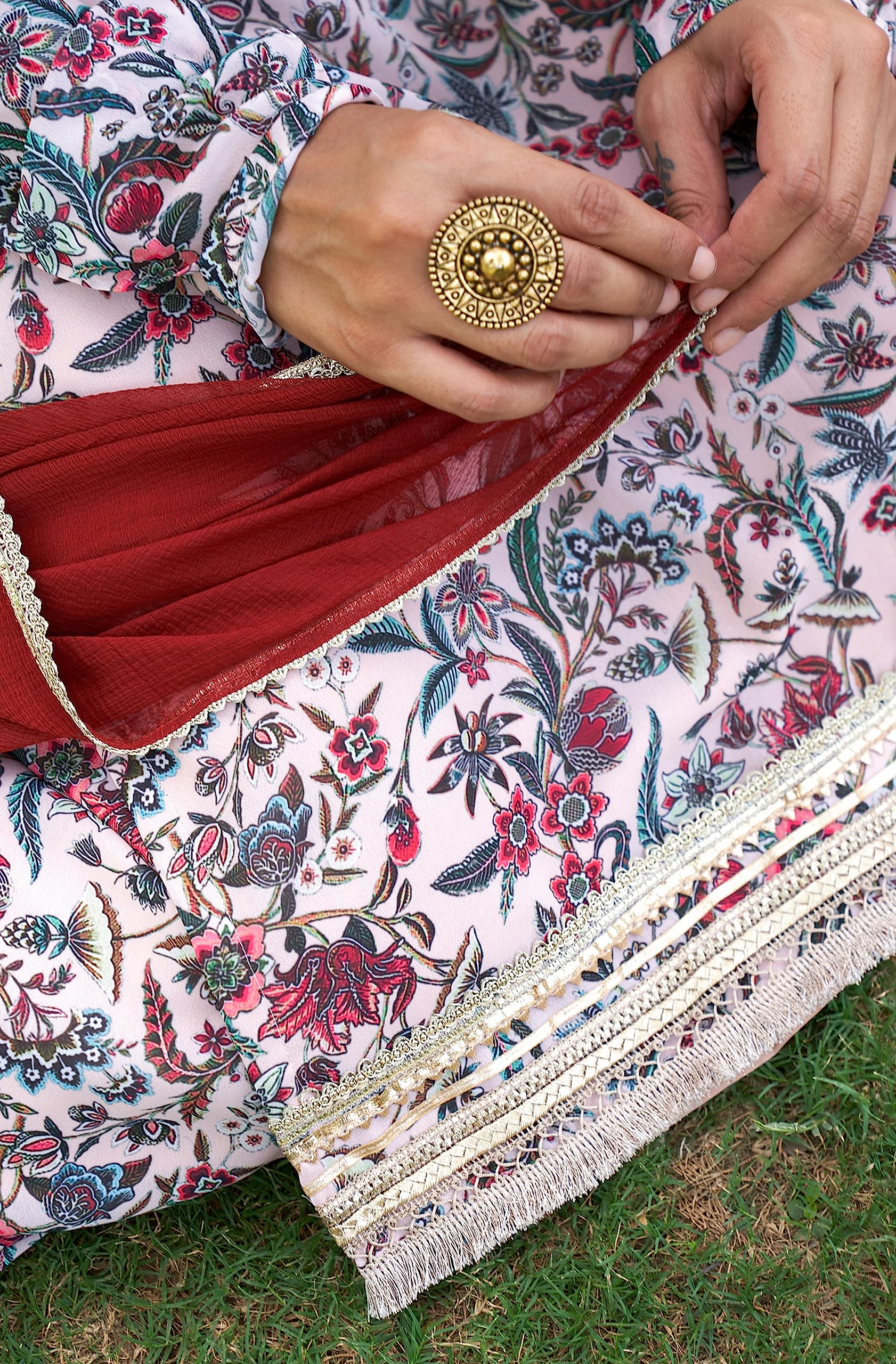 Beige georgette digital floral printed kurta palazzo set and solid rust dupatta by NUDE STITCH perfect for all festive occasions. The kurta is crafted in georgette fabric featuring a straight-cut silhouette with full regular sleeves and a round neck and digital floral prints. The calf-length kurta is adorned with beautiful gota work on the neckline, sleeve hem and hemline of the kurta, adding a touch of elegance. The palazzo designed with a digital floral prints all over with fully elasticated waist band for a comfortable and adjustable fit. A solid rust chiffon dupatta is paired with the set featuring a gota work at the borders. Whether you're attending a festive celebration or a special event, this set is sure to make a statement.