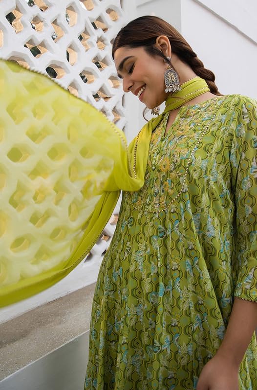 - [Features] Festive Spring-Summer Set for Women, regular quarter sleeves, Printed with Yoke Embroidery and Lace detail, Georgette Kurta, Straight Palazzo, and dupatta set, Lime green hue, 3-piece Style.