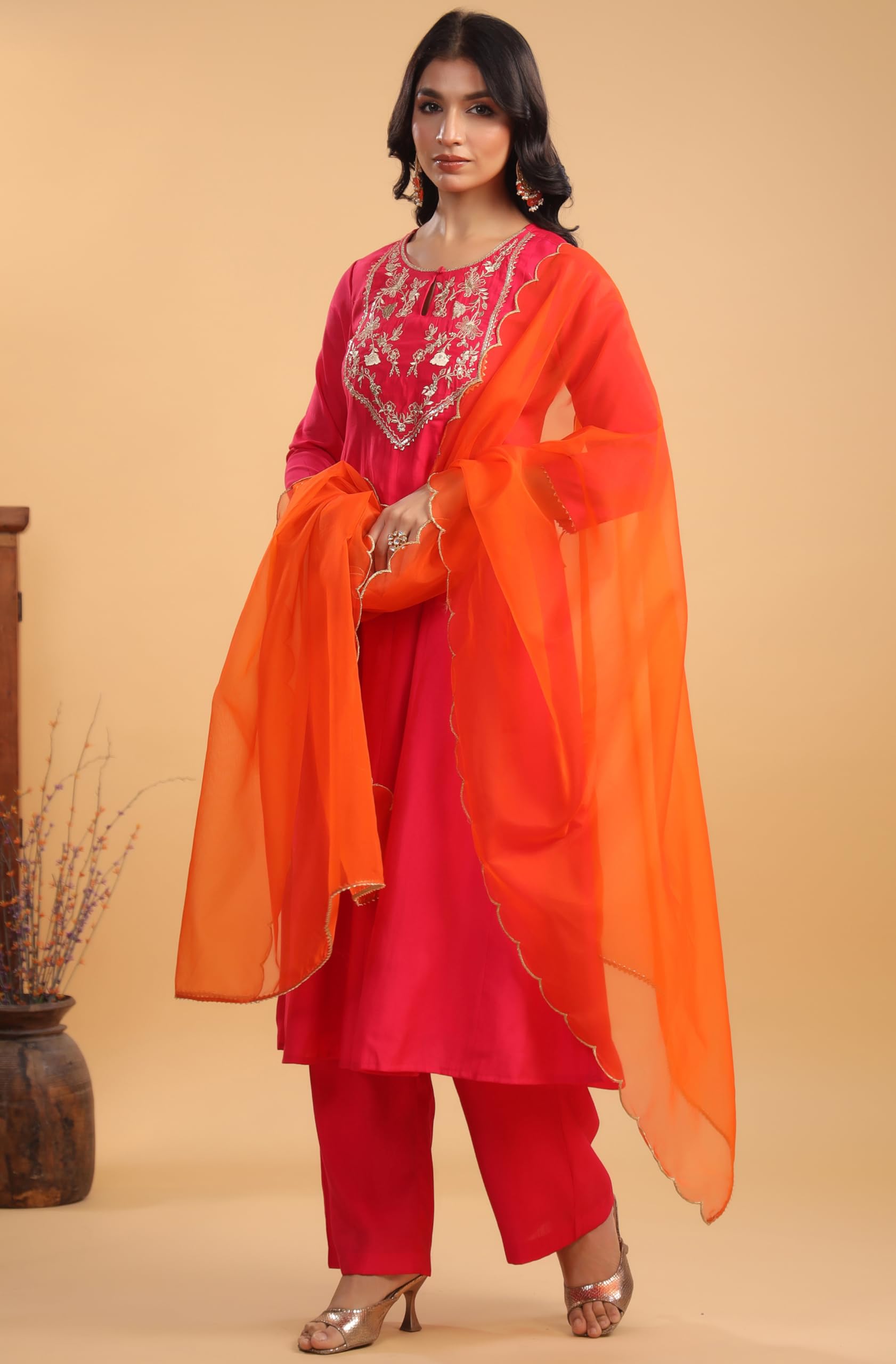 - Package Contains : 1 Kurta :: 1 Bottom :: 1 Dupatta | Kurta Color : Pink | Pant Color : Pink | Dupatta Color : Orange