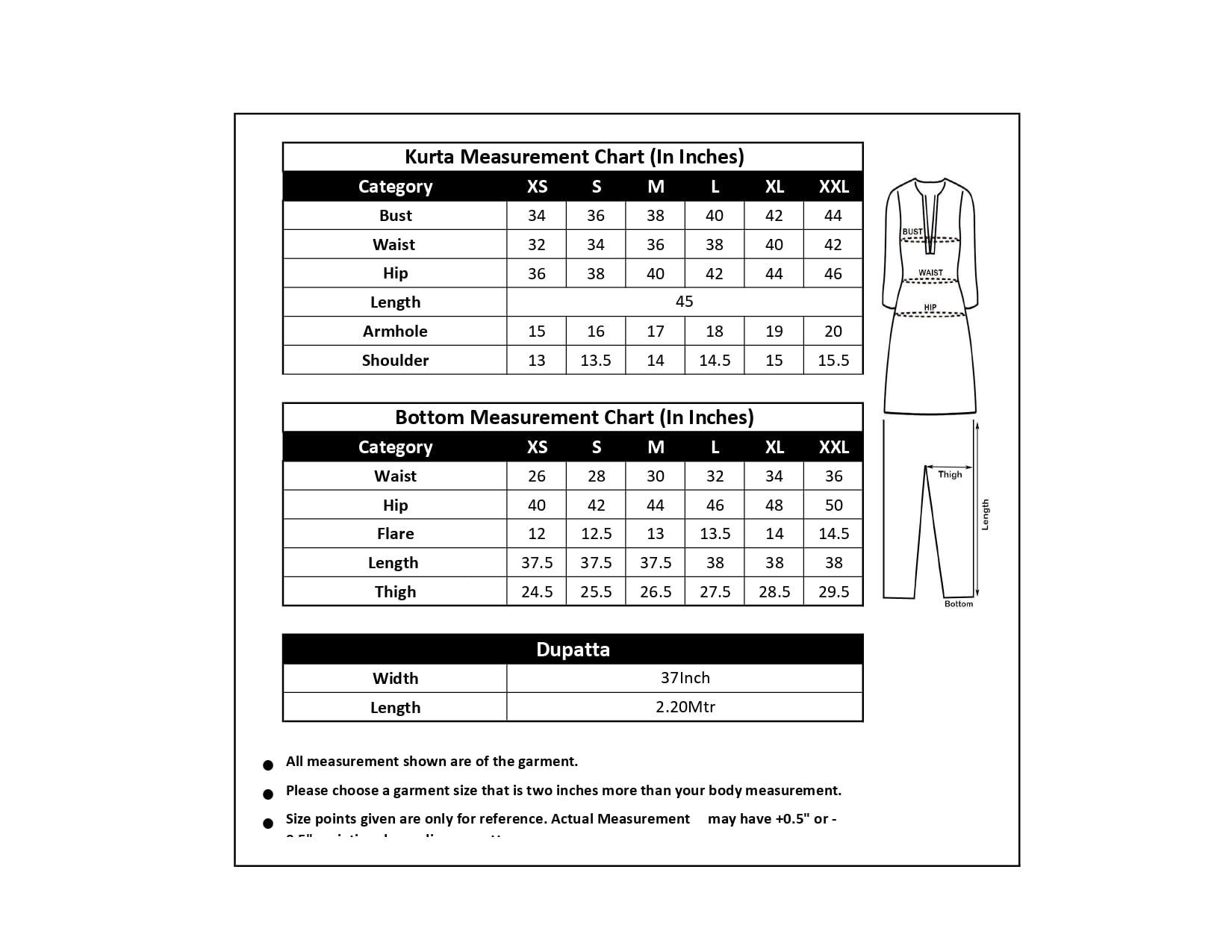 - Kurta Length:: 45Inch| Kurta Sleeves:: 17Inch || Dupatta Length:: 2.20Mtr || Pant Waist:: 32inch