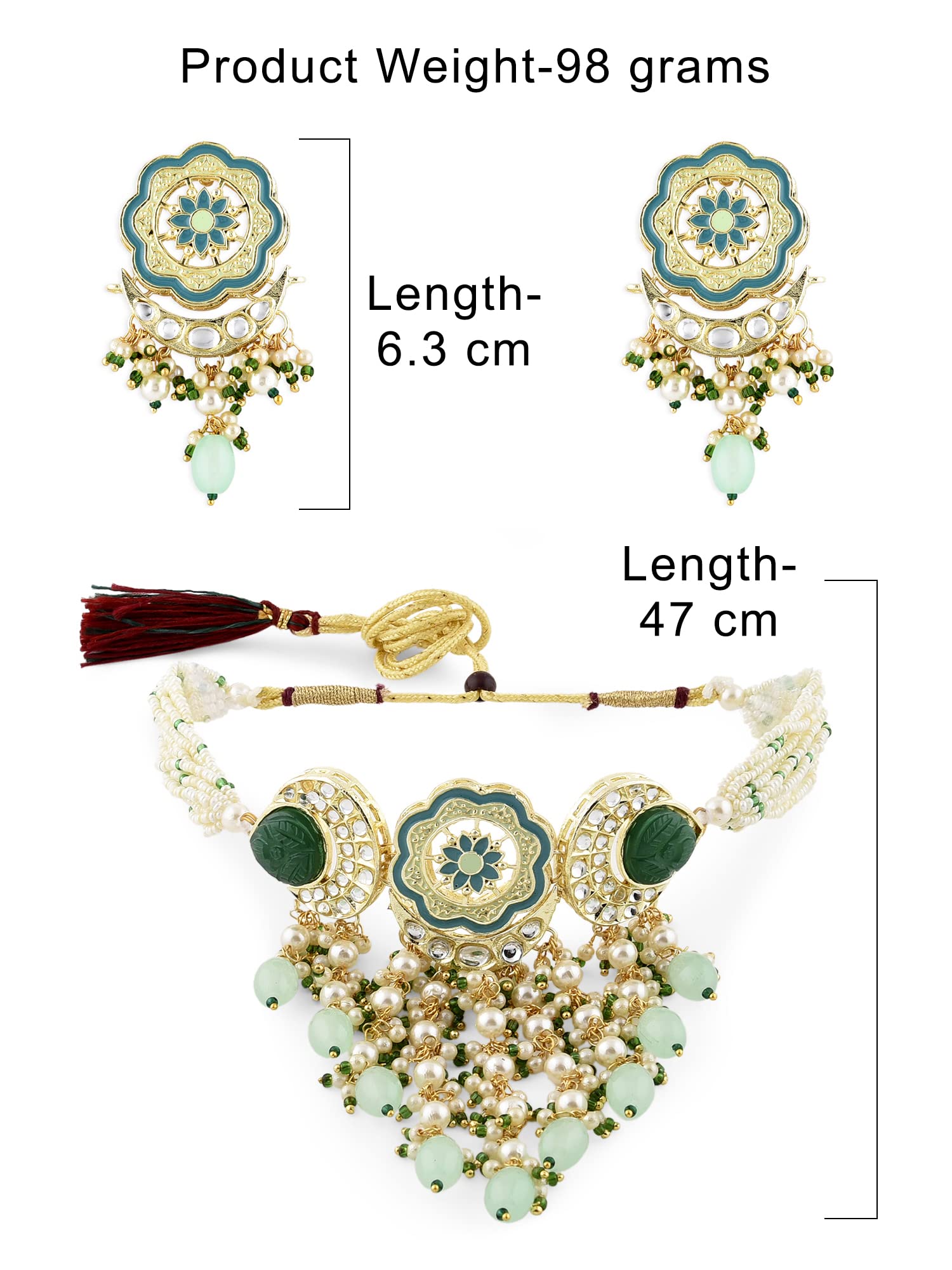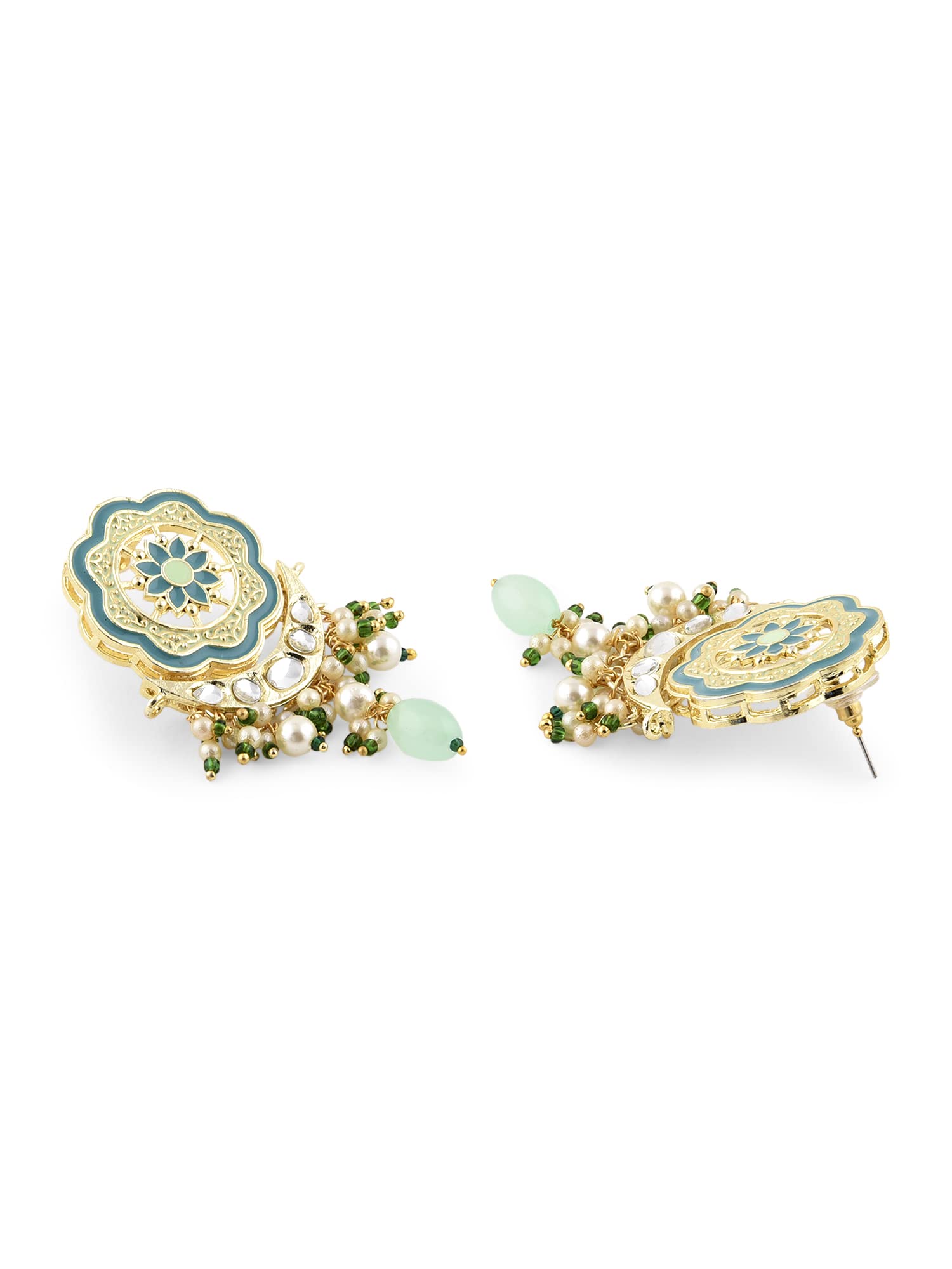 - Color: Turquoise Blue & Green, Material: Alloy, Plating: 22K Yellow Gold, Stone: Kundan & Beads
